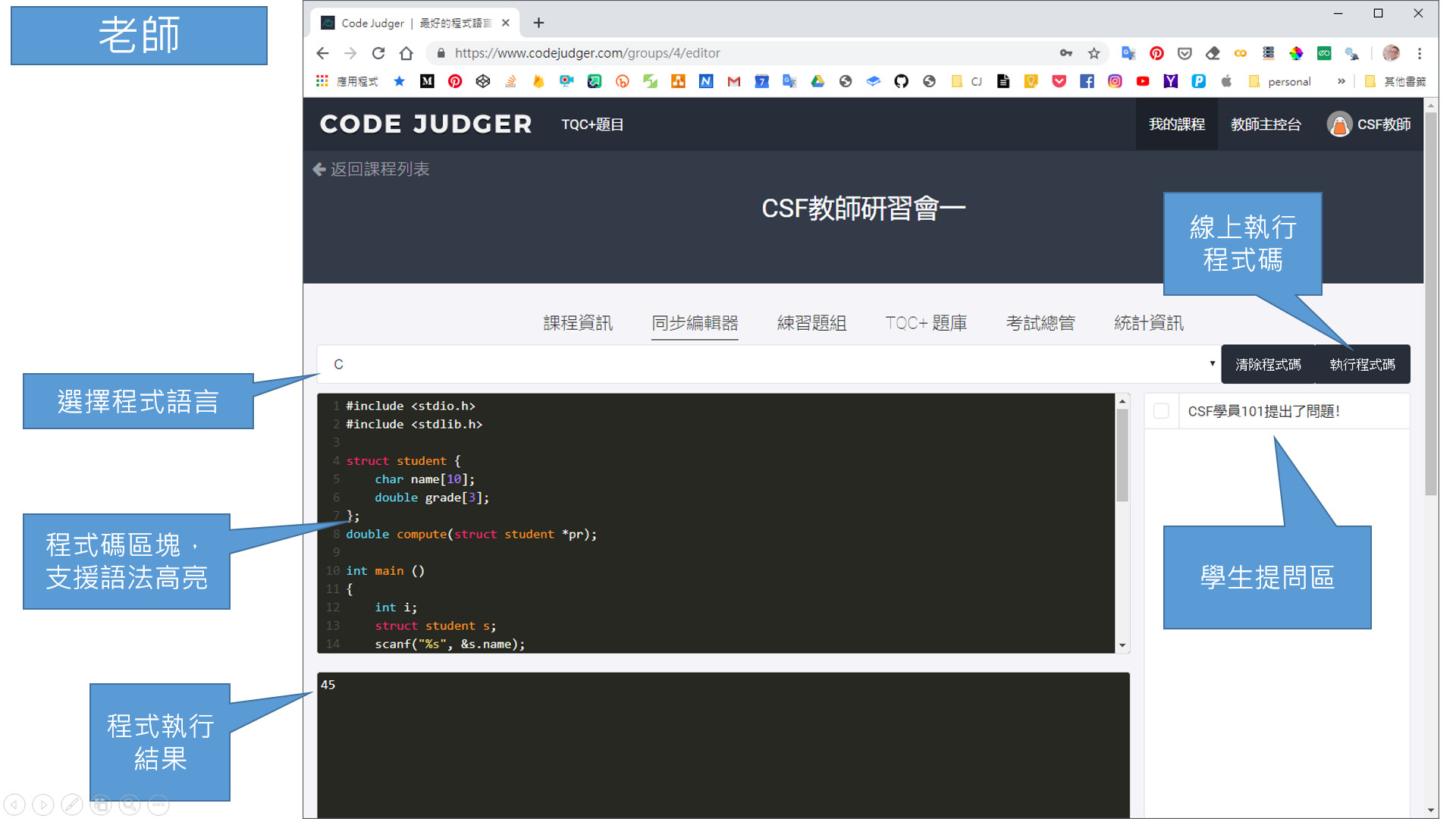 並具有線上提問功能,學生能在線上提問,教師可立即看到學生提問的內容;學生提問的內容可包含程式碼及問題描述。